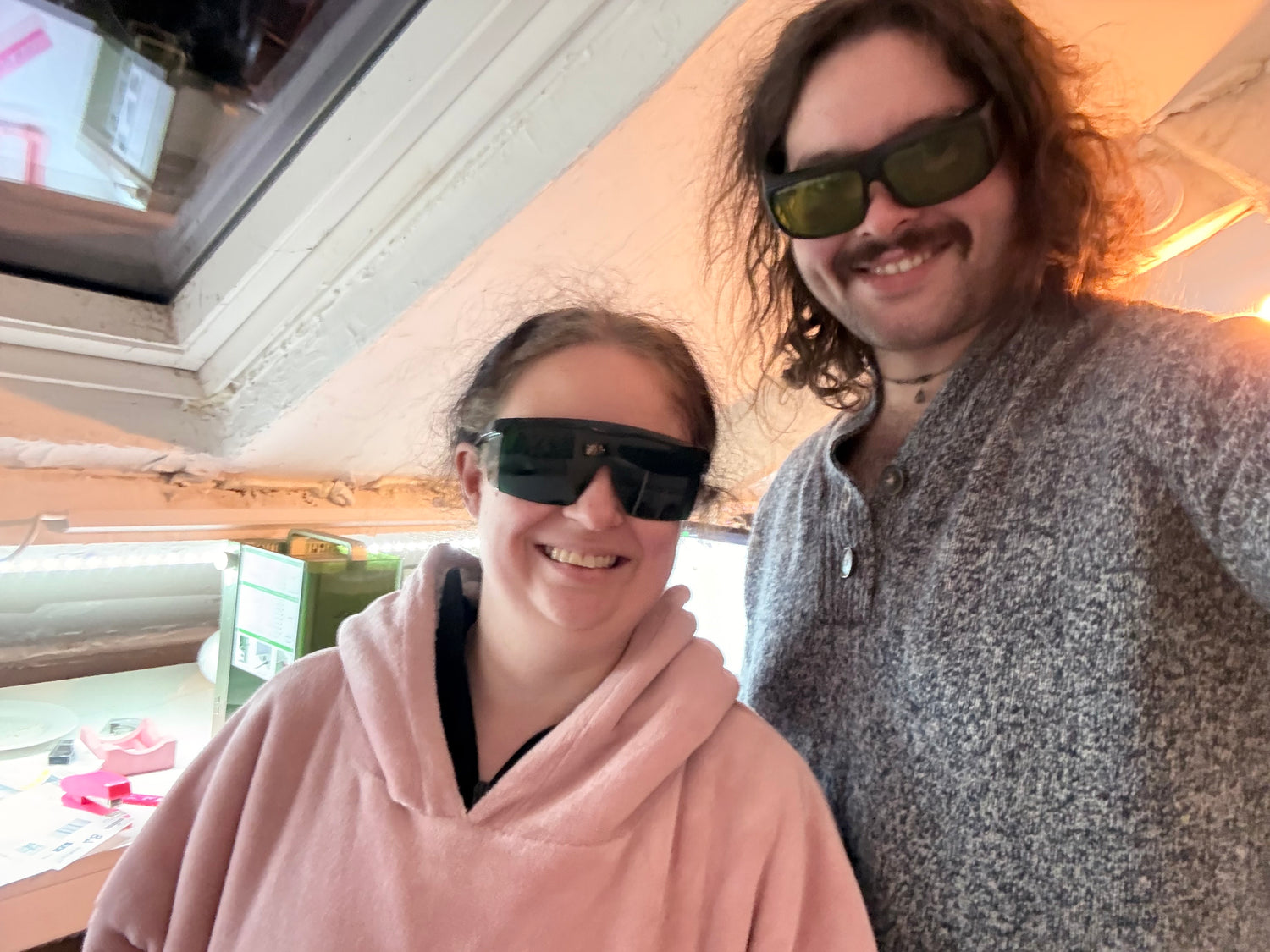 Every item is made to order by Alex and Chloe. No robots, no mile-long conveyor belts, no shouting supervisors, not even a single chinese child labourer in sight – just us, an attic full of lasers, cutters, hopes and dreams, and far too much tea. We still do a little happy dance every time a new order appears.